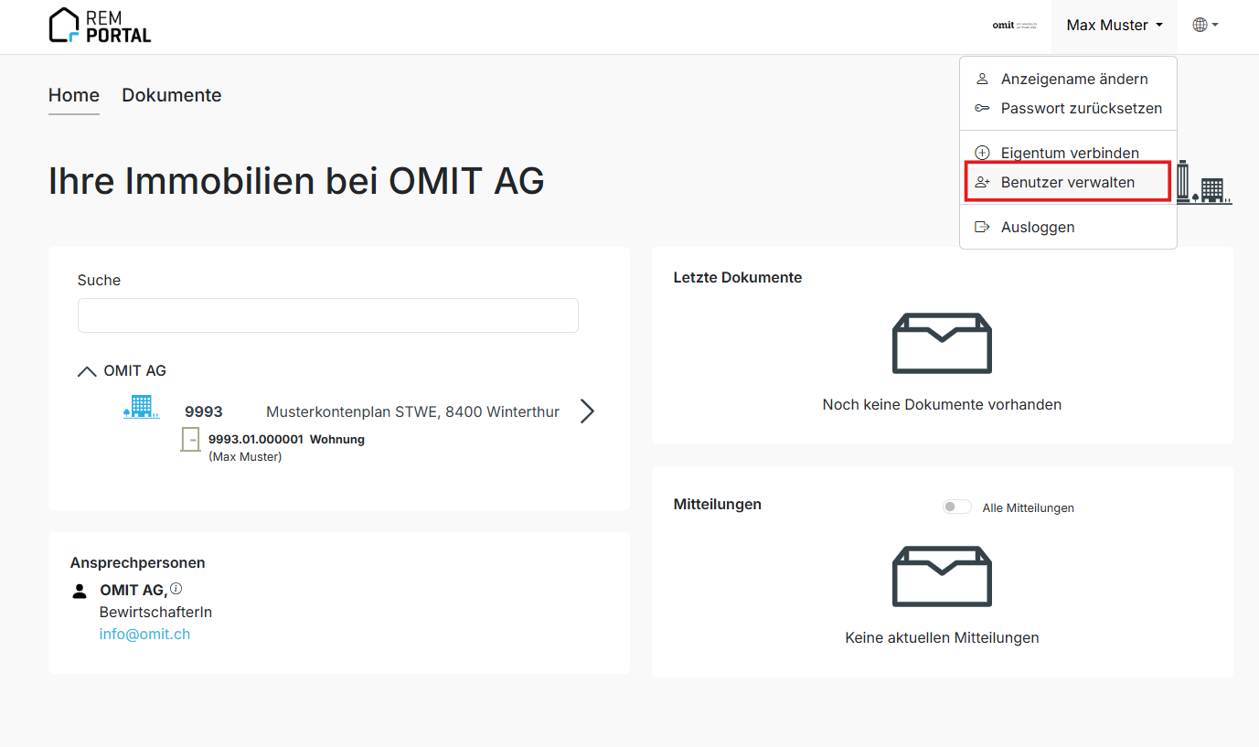 Wenn Sie einen weiteren Benutzer erfassen, sieht dieser ebenfalls alle Dokumente (Abrechnung, Kapitalnachweis, allfällige Mahnungen, etc.) im Eigentümerportal. Entsprechend ist die Funktion nicht dafür geeignet, dass Sie als Eigentümerschaft Ihrer Mieterschaft als weiteren Benutzer berechtigen.