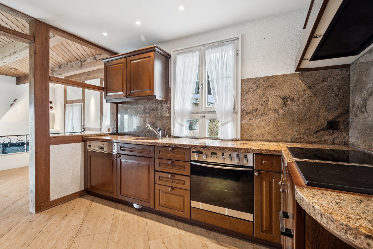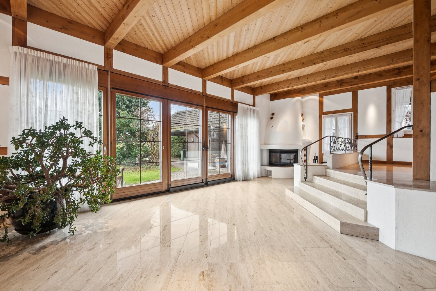 - Hohe abgeschrägte Holzdecken schaffen ein warmes und behagliches Wohnambiente