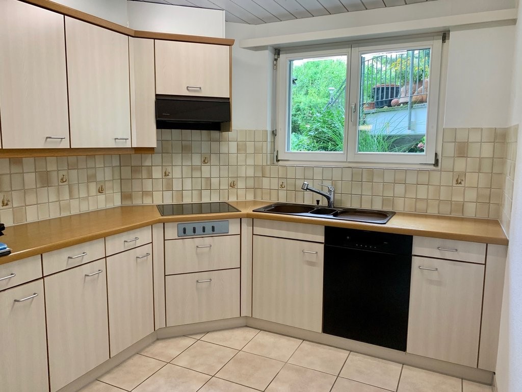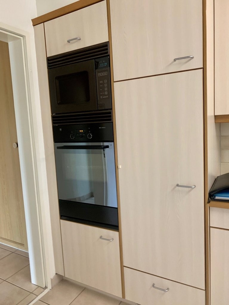 - Küche mit Holzabdeckung, ausgestattet mit Glaskeramik-Kochfeld, Backofen, Kühlschrank mit Gefrierfach und Geschirrspüler