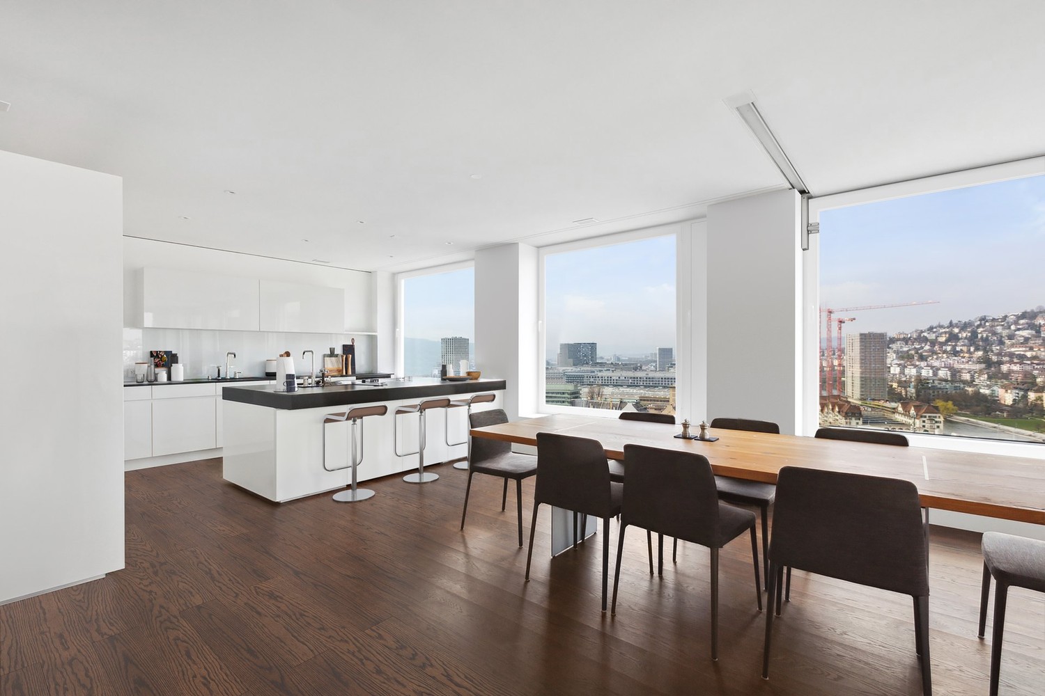Diese traumhafte Wohnung im 15. Obergeschoss des Löwenbräu Black Towers bietet urbanen Luxus, durchdachte Architektur und eine spektakuläre Aussicht über Zürich.